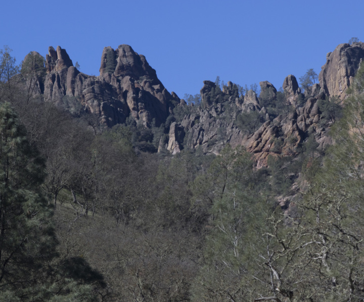 California’s newest national park is home to cliffs, crags, and cave formations that were formed by an ancient volcano. Shaking and quaking along the San Andreas Fault carried volcanic rocks from the eruption, actually 200 miles/321 kilometers southeast, to their present home at this spot in the Salinas Valley. Now, millions of years later, the site is a visual and physical stunner. Follow your flashlight beam as you explore winding caves. Crane your neck to watch climbers scale the rocky pinnacles. Scan the skies for California condors, and hike among spring wildflowers. In summer, temperatures can soar over 100°F during the day, but at night, uncountable stars sparkle in the cool night sky. Pinnacles National Park is divided into two sides—east and west—and there is no way to drive through the park from one side to the other (though you can do it on foot—a roughly 5-mile/8-km hike). The west side is accessible from Highway 101 near the town of Soledad. Head east along Highway 146 to the park entrance. A small visitor center is located there, but there are no overnight accommodations, and no campground. Gates on the west side stay open from 7:30 a.m. to 8 p.m. daily. You can leave after 8 p.m., but you can’t drive in. The east entrance, off Highway 25 roughly 30 miles/48 kilometers south of Hollister, is open 24/7, and there is camping, a visitor center, and a camp store.