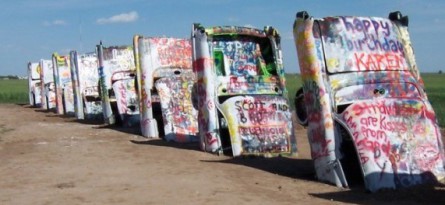East of Amarillo visit Cadillac Ranch, a row of 10 perfectly aligned old Cadillac cars buried nose-first into the barren landscape. Writing graffiti on or otherwise spray painting on the old cars is